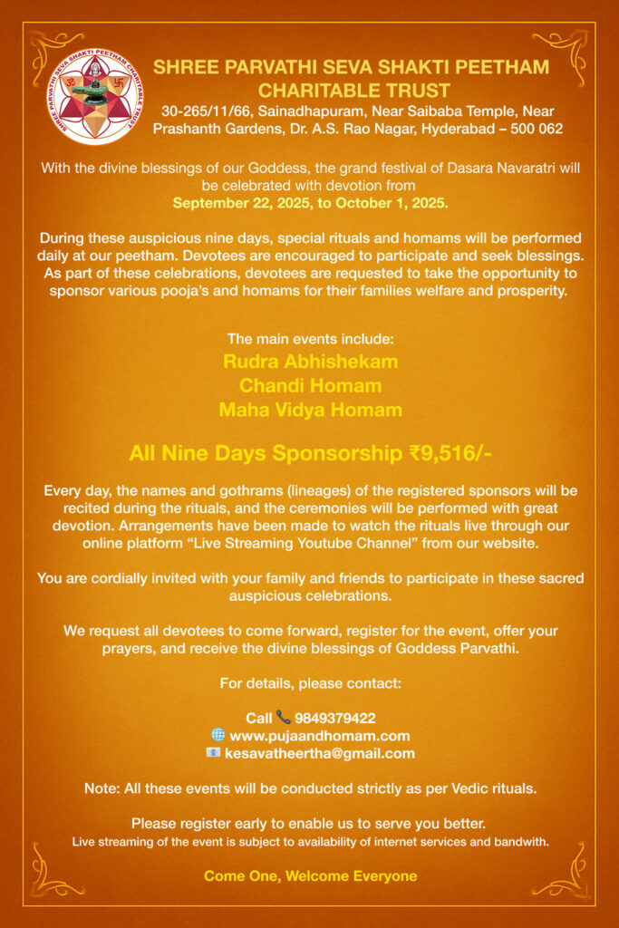 We are performing RUDRAABHISHEKAM & CHANDI HOMAM for well-being of all devotees and for Universal Peace, Happiness and Harmony. Contact for details: 9849379422 In Case if anyone who desires to perform the puja / homam is unable to come and participate at our Peetham, due to personal commitments, you can still avail the puja services by using our online services. Please send your Name, Gothram, Star, (Nakshatram) or your time of birth by email or SMS and make the payment online from our website. We will send you the online live link on request exclusively, so that you can watch online LIVE from where ever you are.
