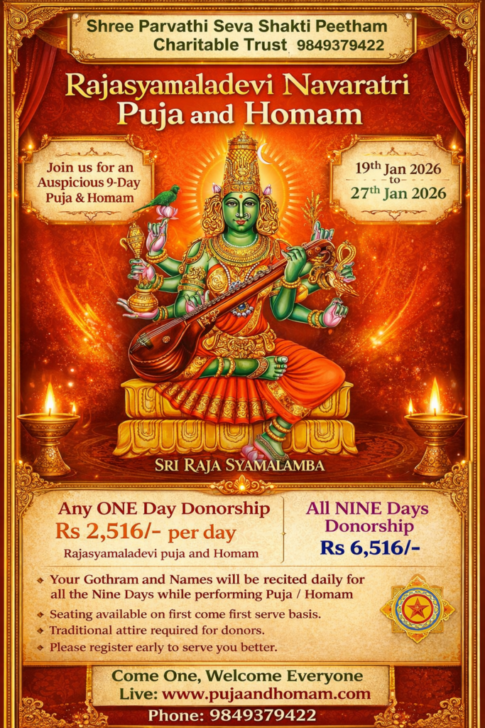 We are performing RUDRAABHISHEKAM & CHANDI HOMAM for well-being of all devotees and for Universal Peace, Happiness and Harmony. Contact for details: 9849379422 In Case if anyone who desires to perform the puja / homam is unable to come and participate at our Peetham, due to personal commitments, you can still avail the puja services by using our online services. Please send your Name, Gothram, Star, (Nakshatram) or your time of birth by email or SMS and make the payment online from our website. We will send you the online live link on request exclusively, so that you can watch online LIVE from where ever you are.