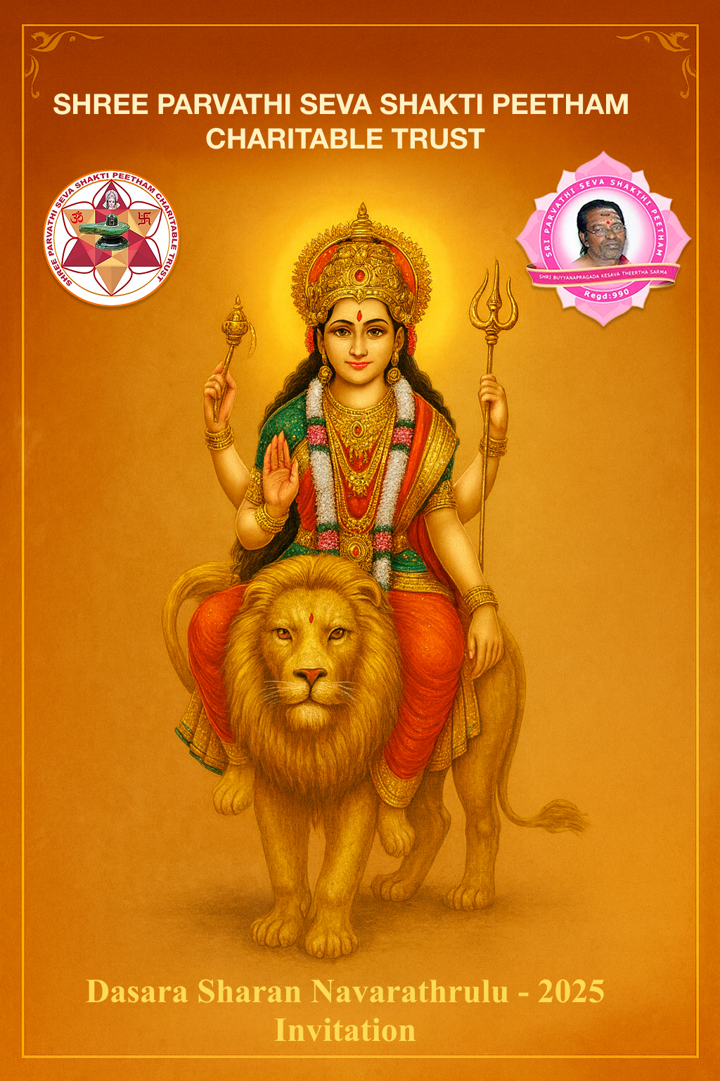 The Dasara Sharan Navaratri is a nine-day festival dedicated to the worship of Goddess Durga, with each day focused on invoking different forms of the goddess through sacred rituals. The daily celebration is centered around three significant rituals: Chandi Homam, Mahavidya Homam, and Rudrabhishekam, all performed to invoke divine blessings and enhance spiritual well-being.