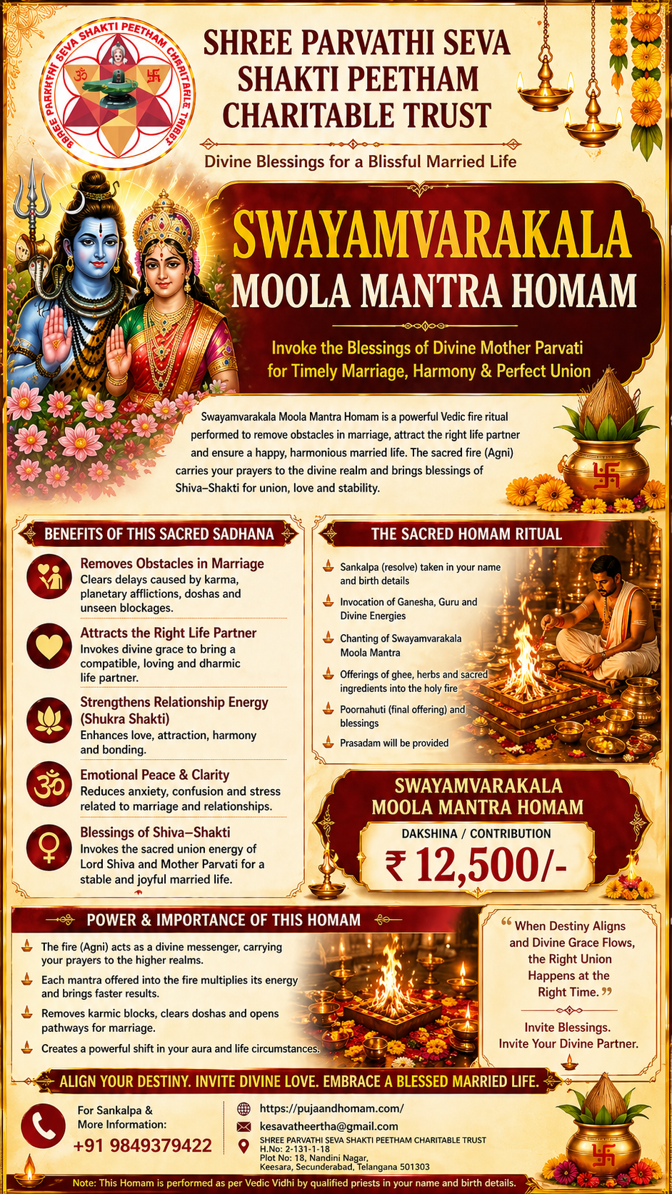 Swayamvarakala Moola Mantra Homam is a sacred Vedic fire ritual performed to directly invoke the blessings of Divine Mother Parvati and Lord Shiva for timely marriage, compatibility, and harmonious relationships.
