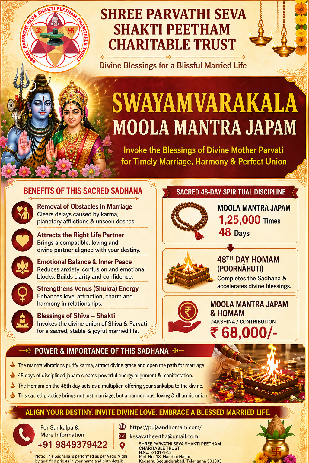 Swayamvarakala Moola Mantra Japam is a highly revered practice in Sanātana Dharma, dedicated to invoking the blessings of Divine Mother Parvati (Swayamvara Parvati) and Lord Shiva, the eternal embodiment of ideal marriage and union.